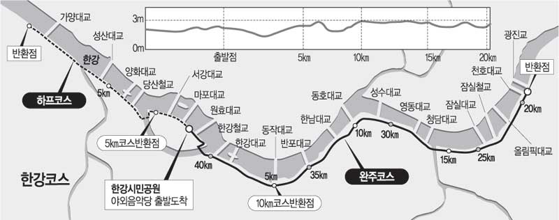 한강둔치 코스는 누구나 쉽게 접근할 수 있다는 게 최대 장점. 또 5km마다 거리 표시판이 있고 바닥에도 500m마다 거리표시가 있어 달리고 싶은 거리만큼 달릴 수 있다. 새벽은 물론 저녁 늦게까지 마라톤 동호인들이 붐빈다.
