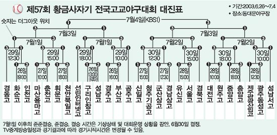 이번 대회에서도 섣부른 예상은 금물. 일단 청룡기 우승주역인 대형타자 김주형(기아 1차지명)이 버티는 광주 동성고와 좌완 최상석이 마운드를 지키고 있는 경주고, 지난해 우승팀 천안북일고가 눈에 띈다. 하지만 최근 10년간 황금사자기에서 서울팀들이 지방팀을 물리치고 7차례나 우승을 가져갈 정도로 초강세인 점을 감안하면 황금사자기 최다 우승팀(7회) 신일고와 서울의 자존심 휘문고도 우승후보다.