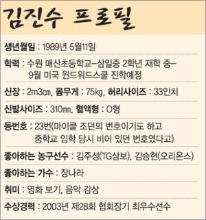 김진수는 지난해 여름 소중한 경험을 했다. NBA 스타 코비 브라이언트(LA레이커스) 트레이시 맥그래디(올랜도 매직) 등을 배출한 미국 아디다스 농구캠프에 국내 선수로는 유일하게 참가해 선진 농구에 눈을 뜬 것. 여기서 그는 ‘야오밍(중국 출신의 NBA 휴스턴 로키츠 선수)’로 불리며 초청선수 80명중 20명의 올스타에 뽑혀 주목받았다.