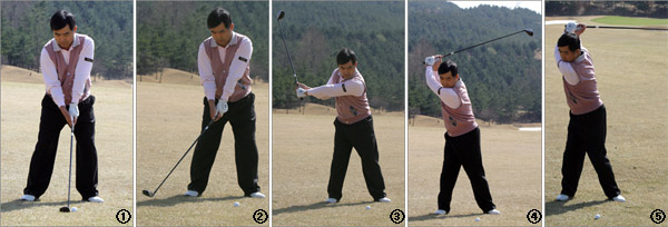 백스윙 정점과 다운스윙 시작이 끊기는 스윙은 좋지 않다. 백스윙 정점에 이르기 전에 왼쪽 하반신(왼쪽 골반과 왼쪽 무릎)은 이미 다운 스윙 동작으로 전환되고 있어야 한다. 즉 체중이 왼발에 충분히 실리는 동시에 왼쪽 히프가 빠르게 회전하면서 임팩트 순간을 맞아야 좋은 FW샷이라고 할 수 있다.