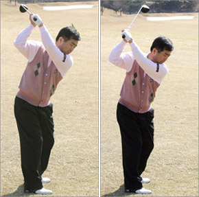 ![]() 플랫한 백스윙 톱(왼쪽)은 쓸어치는 FW샷에, 업라이트한 백스윙 톱은 찍어치는 FW샷에 적합하다. 다운스윙도 백스윙궤도 그대로 복원돼야 한다. 박경모기자