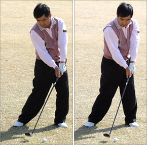 ![]() FW샷의 더핑(일명 뒤땅)을 방지하기 위해서는 하반신의 신속한 체중이동이 다운스윙을 리드해야 한다. 쓸어치기 FW샷(왼쪽)과 찍어치기 FW샷의 임팩트 직전 모습.박경모기자 장소협찬 레이크사이드CC
