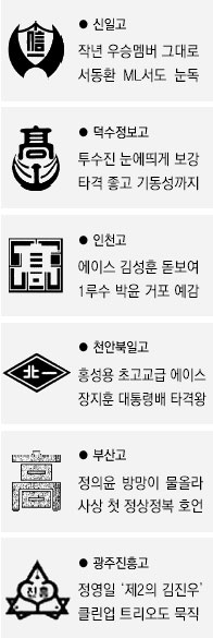 ▽서울=2연패를 노리는 신일고는 지난해 우승 멤버가 고스란히 남아 있어 여전히 우승후보로 꼽힌다. 마운드에선 2년생 김상수와 강민욱 남윤희가 버티며 메이저리그 스카우트들이 눈독을 들인 서동환과 김종명까지 투수진에 가세. 장호연 감독이 최근 사퇴하는 바람에 정미효 코치가 감독대행으로 지휘봉을 잡는다.