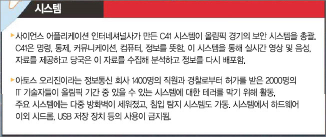 이번 대회의 보안을 총괄하는 곳은 올림픽 선수촌보안사령부(OVSCC). 명칭부터가 예사롭지 않다. 선수촌과 미디어빌리지, 각종 경기장 주변에 자동소총을 어깨에 둘러멘 보안요원은 무려 4만5000여명. 이는 시드니올림픽 때의 3배나 된다.
