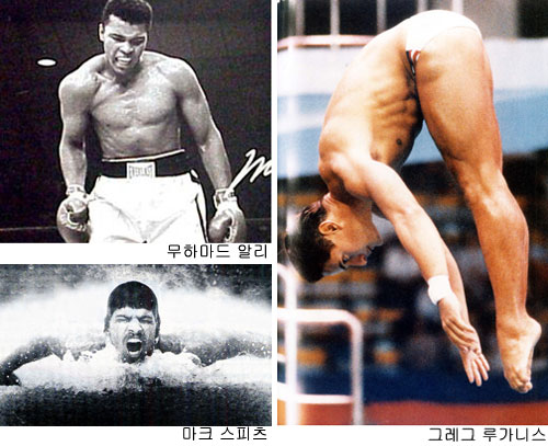 1976년 몬트리올 올림픽 여자체조 2단 평행봉에서 체조 사상 처음으로 10점 만점을 두 번이나 기록하며 금메달 3개를 따낸 나디아 코마네치(루마니아에서 미국으로 망명). 1984년 로스앤젤레스 올림픽과 1988년 서울올림픽 다이빙 2개 종목(스프링보드, 플랫폼)에서 다이빙 사상 첫 2관왕 2연패를 이룬 그레그 루가니스(미국). 1984년 로스앤젤레스 올림픽부터 1996년 애틀랜타 올림픽까지 육상 남자 100m(금 2개), 200m(금 1개), 400m 계주(금 2개), 멀리뛰기(금 4개)에서 금메달 9개를 따낸 칼 루이스(미국).