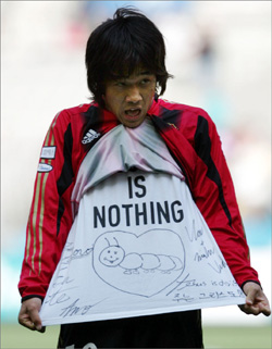 ![]() 전반 16분 동점골을 넣은 뒤 속옷을 드러내 보이는 박주영. 연합