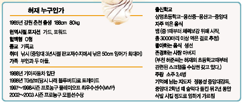 조성원(34) 이상민(33) 등 주전들의 체력 부담도 포스트만 강화된다면 문제될게 없다고 밝혔다. 허 감독은 미국에 있는 동안 수시로 국내 농구 녹화 비디오테이프를 보내준 아버지 허준 씨에 대한 고마움도 잊지 않았다.