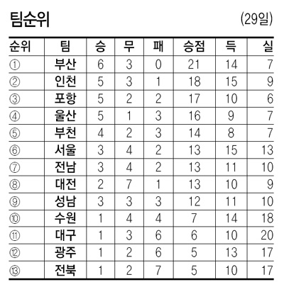 한편 부산 아이파크는 홈에서 광주 상무에 3-2의 역전승을 거두고 9경기 무패(6승 3무)행진을 펼쳤다. 부산은 이날 경기가 없었던 인천 유나이티드를 제치고 단독 선두로 뛰어올랐다. 부산이 정규리그에서 단독 1위에 나선 것은 2001년 9월 9일 이후 3년 9개월 만이다.