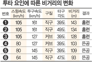 일단 맞혔다면 다음은 타구의 각도. 진공 상태라면 45도겠지만 공기저항을 감안할 때 39∼41도가 알맞다. 이 각도를 만들려면 방망이가 공의 중앙 아래 1, 2mm 지점을 맞혀야 한다.
