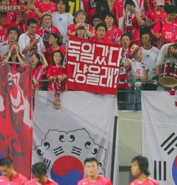 ![]() ‘독일 갔다 그냥 올래?’ 2006 독일 월드컵 아시아지역 최종예선 사우디아라비아와의 경기에서 졸전 끝에 패한 17일 서울월드컵경기장 관중석에는 내년 월드컵 본선에서 한국축구대표팀의 부진을 우려하는 문구가 등장했다. 연합