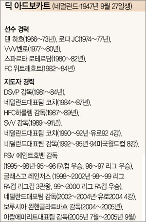 한국축구대표팀 감독에 딕 아드보카트(58·네덜란드) 전 아랍에미리트 감독이 선임됐다는 소식에 네덜란드 교포인 최영호 씨는 “아드보카트 감독은 네덜란드에서도 거스 히딩크 감독과 비슷한 반열의 명감독으로 추앙받는 지도자”라고 전했다.