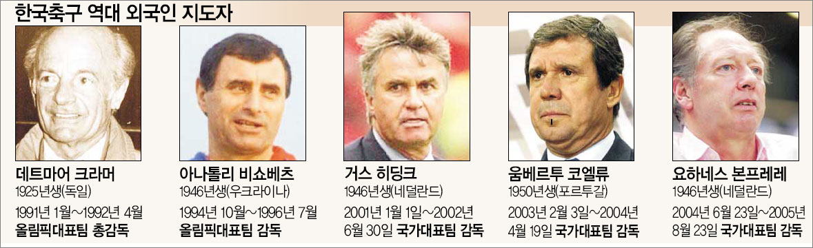 한국축구대표팀은 이로써 데트마어 크라머(독일), 아나톨리 비쇼베츠(우크라이나), 히딩크(네덜란드), 코엘류(포르투갈), 본프레레(네덜란드) 감독에 이어 역대 6번째로 외국인 사령탑을 영입했다.