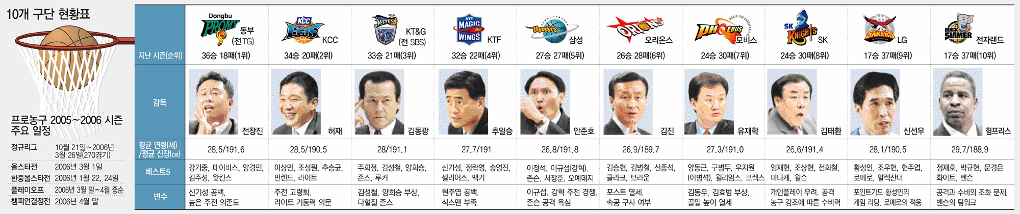 “현대와 KCC에서 3차례 정상에 오른 신선우 감독은 지난 시즌 9위였던 LG를 살릴 것으로 기대를 모은다. 사상 첫 외국인 사령탑에 오른 험프리스 감독 역시 지난 시즌 꼴찌인 전자랜드의 성적을 얼마나 끌어올릴 수 있을지 관심을 끈다. 하지만 선수들과의 언어 장벽, 다른 팀 감독들에 비해 정보력 열세 등은 벌써부터 핸디캡으로 지적된다. ‘잡초’로 불리는 김태환 감독은 SK 사령탑으로 변신했는데 특유의 카리스마로 모래알 같던 선수들을 하나로 모으고 있다.”