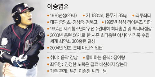 이승엽이 올해 정규 시즌에서 올린 기록은 타율 0.260에 홈런 30개, 타점 82점. 지난해(타율 0.240, 홈런 14개, 타점 50점)보다는 나아졌지만 ‘아시아 홈런왕’의 성적치고는 초라하다. 2년 전 롯데 입단 기자회견에서 장담한 ‘타율 0.290, 홈런 30개, 타점 100점’ 중에서 홈런만 목표를 이룬 셈이다.