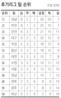 부천 SK는 후반 12분 터진 고기구의 결승골에 힘입어 부산을 1-0으로 꺾고 승점 25를 기록해 이날 울산 현대와 0-0으로 비긴 성남 일화(승점 26)에 이어 후기리그 2위를 지켰다.