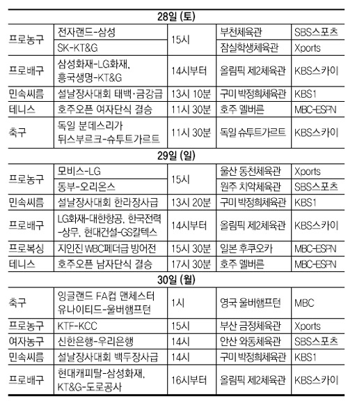 올해 설 연휴에는 그 어느 때보다 굵직한 국내외 스포츠 이벤트가 펼쳐진다. 축구 해외파 태극전사들은 쉴 틈이 없다. 박지성(맨체스터 유나이티드)은 부상에서 복귀해 30일 오전 1시 잉글랜드 축구협회(FA)컵 4라운드에서 울버햄프턴의 설기현과 첫 맞대결을 벌일 전망. 안정환(뒤스부르크)은 28일 슈투트가르트와의 경기에서 독일 분데스리가 데뷔전을 치른다. 프로농구는 1주일간의 올스타 브레이크를 마치고 28일 재개돼 뜨거운 순위 경쟁을 계속한다. 배구 코트에선 28일 삼성화재-LG화재, 30일 현대캐피탈-삼성화재의 라이벌전이 기다리고 있다.