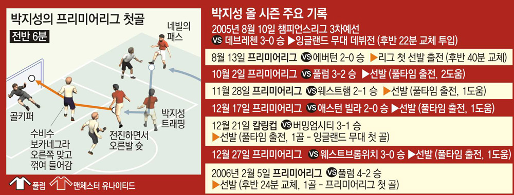 박지성은 5일 올드트래퍼드에서 열린 풀럼과의 홈경기에서 전반 6분 페널티 지역 오른쪽에서 게리 네빌의 패스를 받아 오른발 강슛을 날렸다. 풀럼 수비수 카를로스 보카네그라를 맞고 절묘하게 방향을 튼 공은 골문 오른쪽으로 빨려 들어갔다. 프리미어리그에서 처음으로 한국인이 골을 기록하는 순간이었다. 박지성은 지난해 12월 21일 버밍엄시티와의 칼링컵 경기에서 잉글랜드 무대 첫 골을 터뜨렸지만 프리미어리그에서는 골이 없었다. 정규리그 23경기, 리그 데뷔 176일 만에 터트린 골.