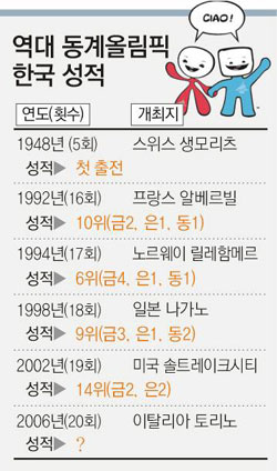 한국은 토리노 동계올림픽에서 메달밭 쇼트트랙을 앞세워 금 3, 은 2, 동메달 2개 등 7개의 메달을 획득해 1998년 나가노대회(9위) 이후 8년 만에 종합 순위 10위 이내에 복귀한다는 목표다.