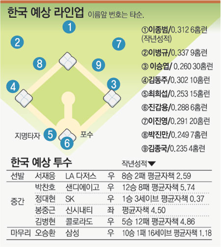 한국팀의 주력은 박찬호(샌디에이고), 서재응(LA 다저스), 김병현(콜로라도), 이승엽(요미우리), 최희섭(LA 다저스) 등 해외파 선수다.
