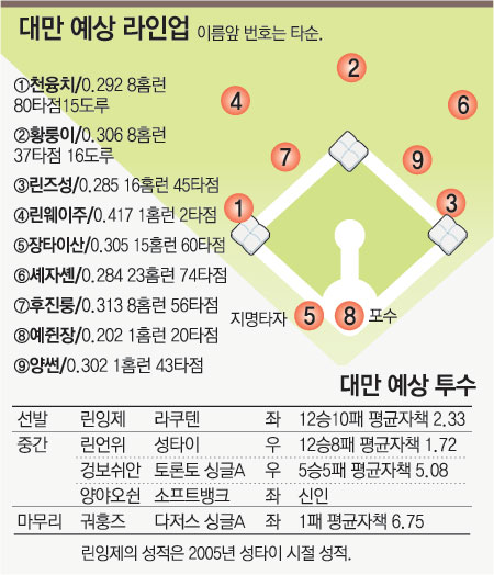 대만 선발은 린언위(성타이)로 결정됐다. 그는 작년 대만 리그에서 12승 8패 평균 자책 1.72의 빼어난 성적을 올린 오른손 정통파 투수.