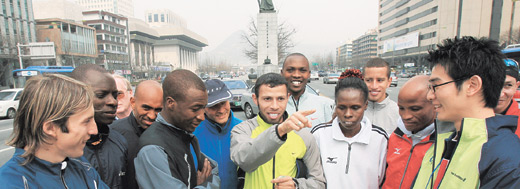 ![]() “목표는 당연히 우승.” 2006 서울국제마라톤대회 겸 제77회 동아마라톤대회에 참가한 세계의 건각들은 하나같이 우승을 장담했다. 지난해 챔피언 윌리엄 킵상(케냐)은 10일 서울 중구 서울프라자호텔에서 열린 기자회견에서 “컨디션이 좋다. 지금 상태라면 2시간 7분대는 충분히 가능하다. 2연패는 문제없다”고 자신했다. 한국 마라톤의 기대주 지영준(코오롱)은 “2시간 7분대가 목표다. 3개월 동안 훈련한 결실을 우승으로 보답받고 싶다”고 말했다. 그의 개인 최고기록은 2003 서울국제마라톤에서 세운 2시간 8분 43초. 2003, 2004년 챔피언인 남아공의 거트 타이스(오른쪽에서 두 번째)를 비롯한 참가자들이 10일 서울 종로구 세종로 이순신 장군 동상 앞에서 코스 설명을 듣고 있다. 홍진환 기자 |
