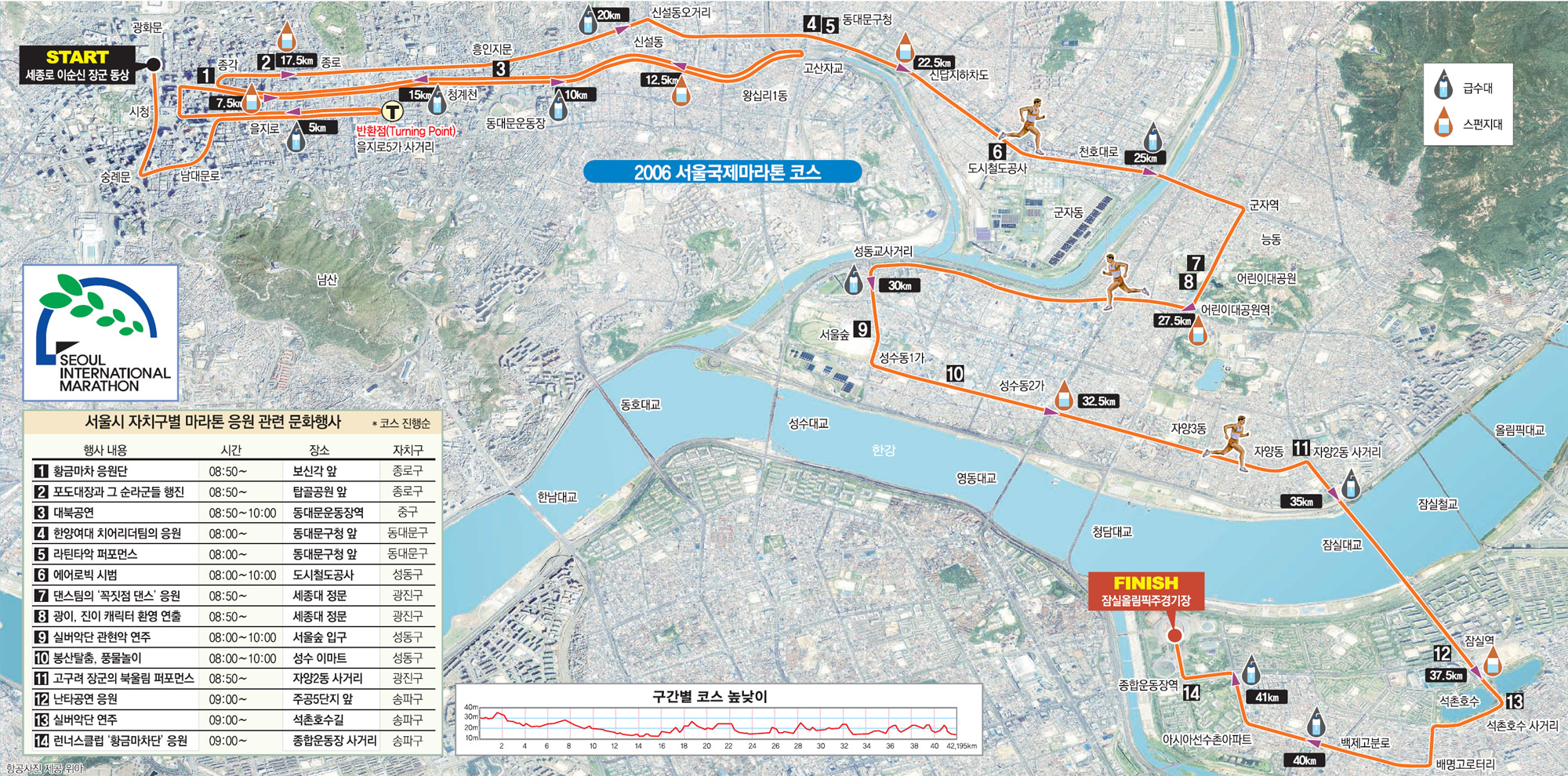 2006 서울국제마라톤대회 겸 제77회 동아마라톤대회가 12일 오전 8시 서울 세종문화회관 앞을 출발해 잠실주경기장에 이르는 42.195km 코스에서 열립니다. 이에 따라 오전 5시 30분부터 일반 마스터스 참가자들이 골인하는 오후 1시 34분까지 지점별로 짧게는 1시간 17분에서 길게는 4시간가량 차량 통제가 실시됩니다.