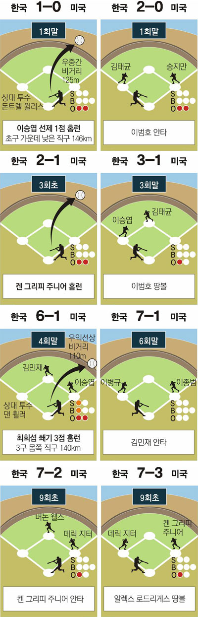 호쾌한 야구를 지향한다고 자부하던 미국은 4회 이승엽을 고의볼넷으로 걸렀다. 2루수 체이스 어틀리(필라델피아)는 6회 이종범(기아)의 내야 안타성 땅볼 타구 때 발이 꼬여 넘어졌고, 최희섭의 평범한 파울 플라이를 놓쳤다. 반면 한국팀은 모든 톱니바퀴가 착착 맞아 들어가는 완벽한 팀이었다.