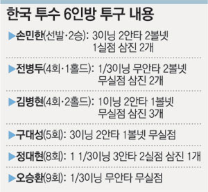 타자들이 벌어놓은 점수는 최강의 마운드가 지켜냈다. 선발 손민한(롯데)은 3이닝을 1실점으로 막아 승리투수가 됐다. 김병현(콜로라도)-전병두(기아)-구대성(한화)-정대현(SK)-오승환(삼성)으로 이어진 중간 계투진 역시 고비마다 미국 타선을 봉쇄했다.
