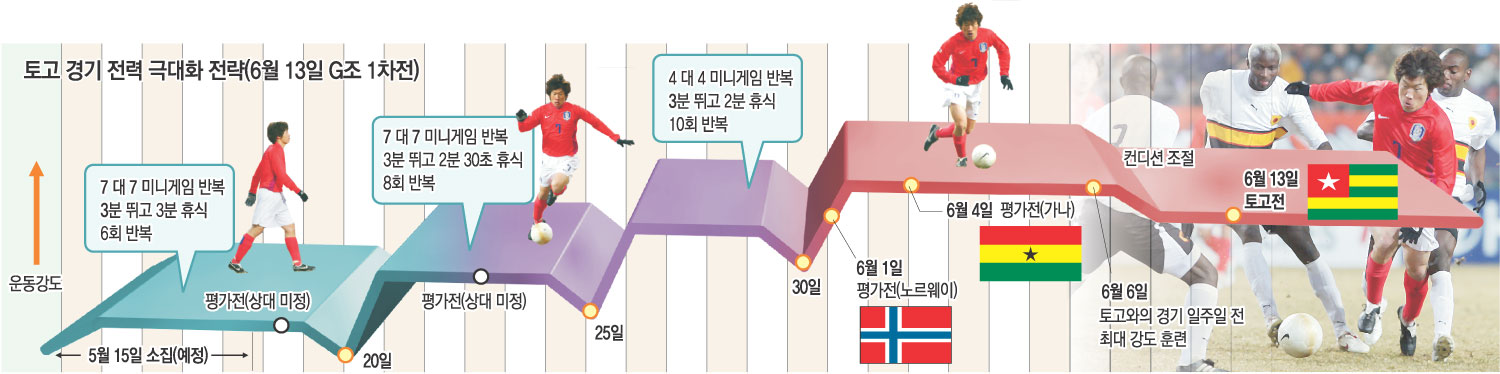 6월 13일 열리는 토고와의 G조 예선 1차전에서 이겨야만 16강에 갈 수 있다는 게 코칭스태프의 판단. 이에 따라 ‘아드보카트 호’는 토고전에 맞춰 기술과 전술, 체력, 정신력 등 종합적인 면에서 전력 극대화를 꾀하고 있다.