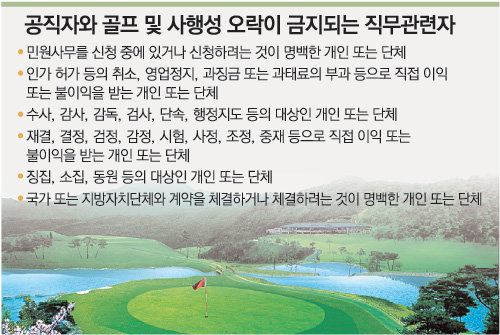 이 지침에 따르면 공직자와의 골프가 금지되는 직무 관련자는 △민원을 냈거나 신청하려는 개인 및 단체 △인허가 취소, 영업정지 등으로 이익이나 불이익을 받은 개인 및 단체 △수사 감사 감독 검사 단속 행정지도 등의 대상인 개인 및 단체 등이다.