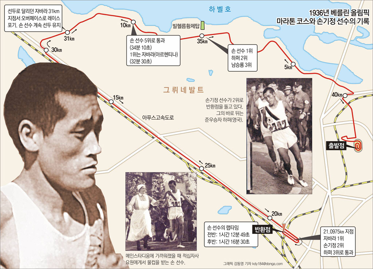 손 선생은 트랙을 1.25바퀴(500m) 돌고 56명 중 22번째로 운동장을 빠져나갔다. 강력한 우승 후보였던 아르헨티나의 자바라(1932년 로스앤젤레스 올림픽 우승자)가 2위와 150m 거리를 두고 선두로 질주했다.