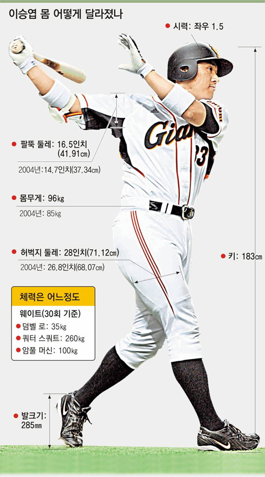 이는 ‘몸짱’으로 거듭난 이승엽이 힘도 ‘장사’가 되었기 때문. 요즘 이승엽을 보면 헐렁한 유니폼을 입고 있어도 단단한 몸매가 확연히 드러난다.