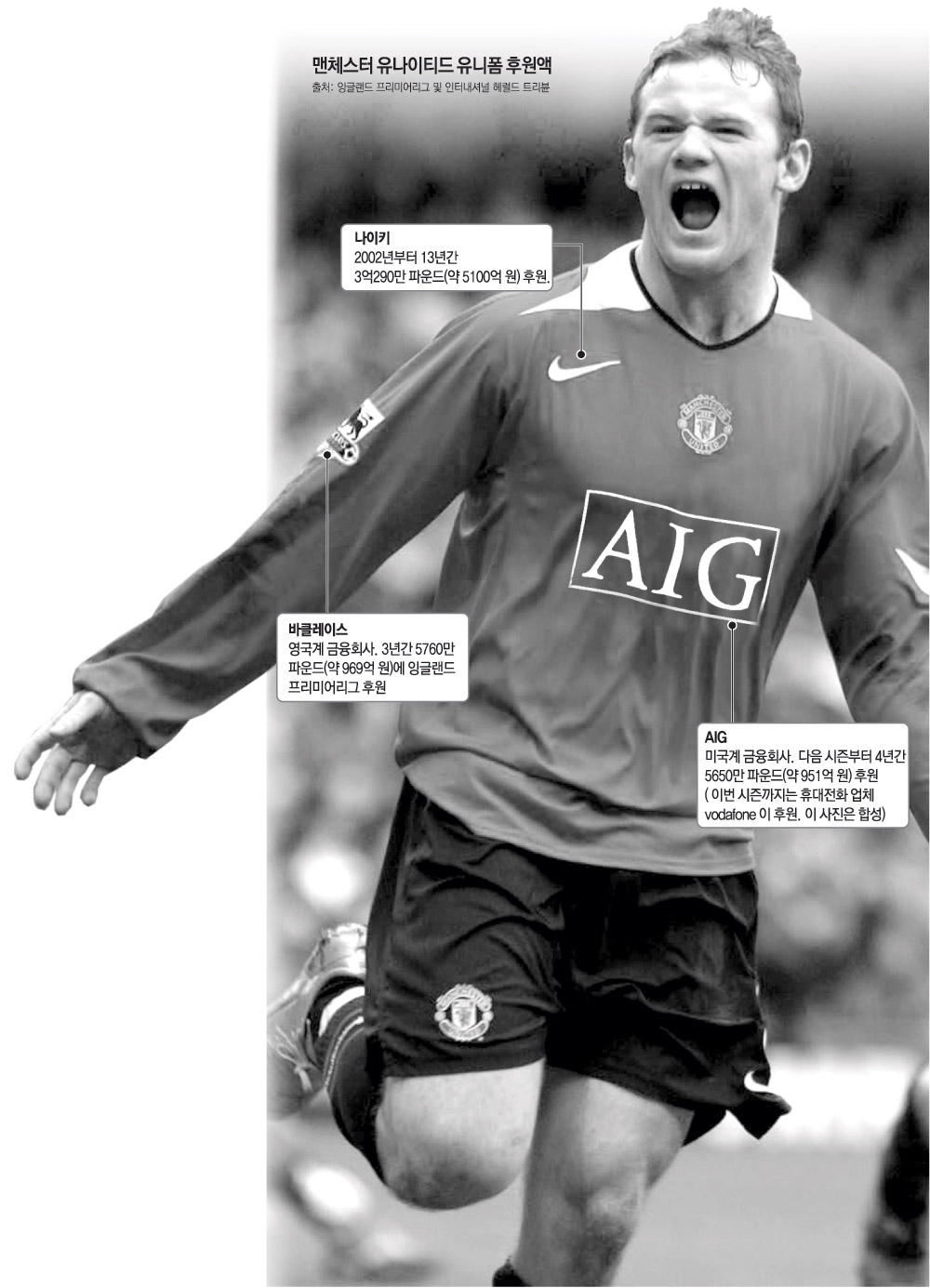 박지성의 소속팀 맨체스터 유나이티드는 최근 미국계 금융회사인 AIG와 4년간 5650만 파운드(약 951억 원)에 계약했다. 태국의 맥주회사, 대만의 휴대전화 업체 등도 앞 다투어 프리미어리그 혹은 스페인의 프리메라리가 명문 팀 유니폼에 자사 로고를 광고하고 있다. 그만큼 이들 리그가 국제화되었다는 증거다.