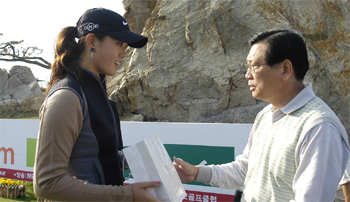 KPGA 회장인 박삼구 금호아시아나그룹 회장이 농담을 건네자 ‘골프 천재소녀’ 미셸 위(17)의 웃음이 터져 나왔다.