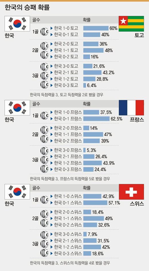 이를 전제로 확률 계산을 해 본 결과 한국-토고전에서는 1골이 터질 경우 한국이 이길 경우는 60%로 계산됐다. 2골이 터질 경우에는 1-1로 비길 확률이 48%, 3골이 터질 경우에는 2-1로 이길 확률이 43.2%로 가장 높았다.