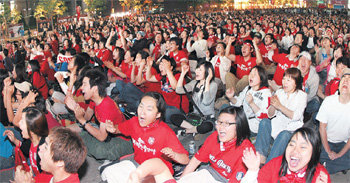 경기가 시작되자 기차역과 고속버스터미널은 물론 대형 TV가 설치된 거리 곳곳마다 발걸음을 멈추고 축구를 시청하는 인파로 북적였다. 응원이 절정을 맞은 것은 후반 29분 김두현(24) 선수가 첫 골을 뽑아낸 순간. 서울광장 주변에 모인 응원단 1만여 명의 함성이 거리를 뒤덮었다.