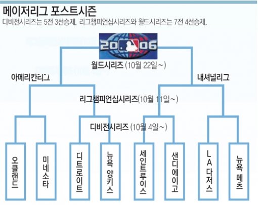 아메리칸리그에서는 뉴욕 양키스와 미네소타, 오클랜드가 지구 우승팀이다. 여기에 디트로이트가 와일드카드로 마지막 티켓을 잡았다. 양 리그의 디비전시리즈는 4일 시작된다.