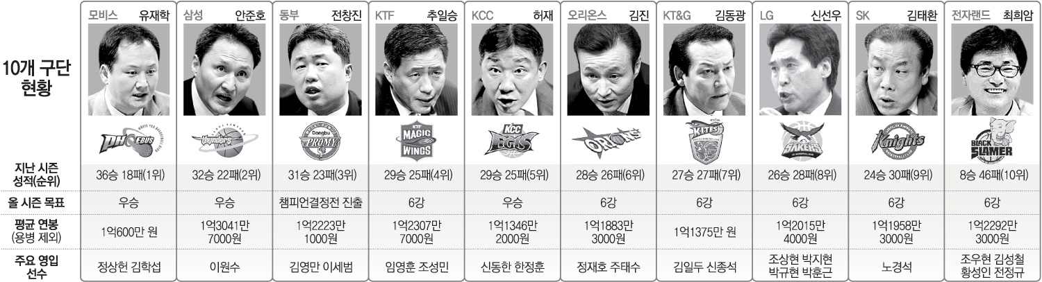 ▽3강 유지=지난 정규 시즌 1위 모비스와 2위 삼성, 3위 동부는 여전히 안정된 모습. 모비스는 최우수 용병 수상자 윌리엄스가 건재한 데다 새로 뽑은 센터 버지스(204cm)가 공격력까지 갖춰 골밑이 든든해졌다. 삼성은 용병 오예데지와 존슨을 비롯해 이규섭, 강혁, 서장훈의 베스트5를 그대로 보유해 탄탄한 조직력이 강점. 김주성이 버티는 동부는 취약하던 가드진을 이세범, 강대협, 배길태 등을 영입해 강화했다. 새롭게 2, 3쿼터에 외국인 선수가 1명만 뛰도록 규정이 바뀌면서 용병급인 서장훈과 김주성이 뛰는 삼성과 동부가 반사 이익을 얻을 전망. 김진 감독의 용병술이 돋보이는 오리온스는 이들 ‘빅3’를 위협할 강력한 후보다.