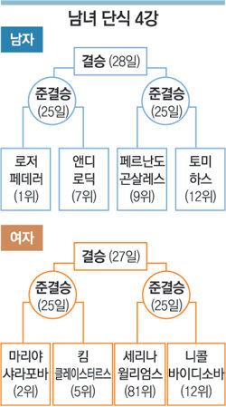 3년 연속 4강에 오르며 지난해 US오픈 우승에 이은 메이저 2연승을 노리는 샤라포바는 25일 세계 5위 킴 클레이스터르스(벨기에)와 결승 진출을 다툰다. 올여름 결혼을 앞두고 이번이 마지막 출전인 클레이스터르스는 세계 7위 마르티나 힝기스(스위스)에게 2-1(3-6, 6-4, 6-3)로 역전승했다. 샤라포바는 클레이스터르스와의 상대 전적에서 2승 4패로 뒤졌으나 최근 2연승의 상승세를 타고 있다.