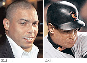 국제축구연맹(FIFA) 선정 올해의 선수에 3번이나 뽑힌 브라질 출신의 축구스타 호나우두(31·레알 마드리드). 또 한 명은 통산 588 홈런으로 미국 현역 프로 야구선수 중 통산 홈런 2위에 올라 있는 거포 새미 소사(39·전 볼티모어).
