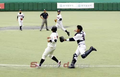 30일 서울 동대문야구장에서 진행중인 제61회 황금사자기 전국고교야구대회 다섯째날 16강전 배재고 vs 경동고 경기에서 경동고 선수가 기회를 엿보며 홈으로 달렸지만 배재고의 빠른 대처로 배재고 포수에게 잡혔다.