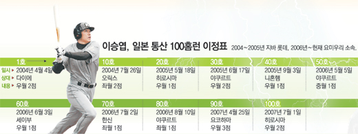 생애 첫 2군행 등 힘든 적응기를 거치며 첫해 기록한 홈런은 14개. 2005년 30개의 대포를 터뜨려 홈런 타자로서의 이미지를 굳힌 이승엽은 지난해 연봉 삭감을 감수한 채 팀을 옮긴 뒤 41홈런, 타율 0.323이라는 빼어난 성적으로 ‘제70대 요미우리 4번 타자’ 역할을 완벽하게 해냈다.
