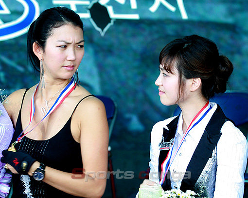 9일 춘천국제레저경기 엠프리스컵 나인볼대회가 열린 춘천 삼천동 야외음악당 특설무대에서 자넷리(좌측)가 우승을 차지한 후 금메달을 거머쥔 채 차유람을 노려보고 있다.