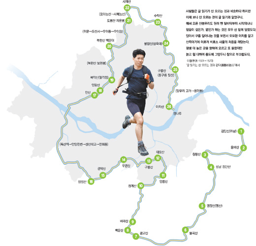 출발지점은 경기 하남의 바깥창모루 옆 팔당대교. 첫 봉우리 ①검단산(하남)을 거쳐 시계 방향으로 ②용마산→③청량산→④성남 검단산→⑤영장산(맹산)→⑥불곡산→(탄천→오리역→용인수지)→⑦광교산→⑧백운산→⑨바라산→⑩청계산→⑪인릉산→⑫대모산→⑬구룡산→⑭우면산→⑮관악산→○16삼성산→(독산역→안양천변→성산대교→연희동)→○17안산→○18인왕산→○19북악산(팔각정)→(북한산 보현봉)→○20북한산 백운대→(위문→도선사→우이동→우이암)→○21도봉산 자운봉→(포대능선→사패능선)→○22사패산→○23수락산→○24불암산→(삼육대)→○25구릉산(동구릉 뒷산)→(망우리 고개→용마봉)→○26아차산→광나루에 도착했다. 오전 7시에 출발, 도착은 사흘째 오후.
