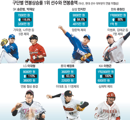한 구단 관계자는 “1억 원 이상 받는 선수들은 부담이 크기 때문에 그만큼 상승폭이 작을 수밖에 없다. 5000만 원 전후의 선수들이 가장 크게 오른다”고 말했다.