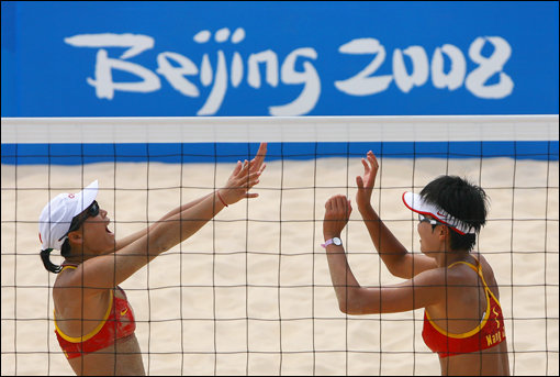 중국의 톈 자와 왕지에가 승리한 뒤 하이파이브를 하고 있다.