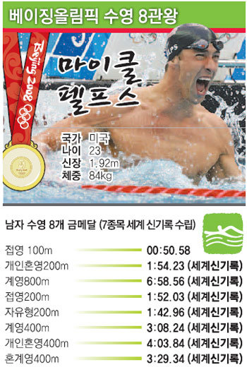 펠프스는 첫 올림픽이었던 2000년 시드니 대회 200m 접영에서 5위를 기록했다.·열 다섯 살때였다. 두번째 아테네대회에서 금메달 6개와 동메달 2개를 땄다. 세 번째 베이징대회에선 금메달 8개를 땄고 그 중 7개 금메달은 세계신기록이었다.
