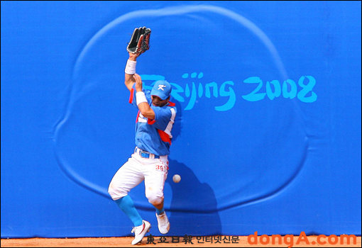 18일 베이징 우커송야구장에서 열린 한국 야구팀의 2008베이징 올림픽 5차전(대만). 중견수 이종욱이 강한 햇볕에 눈이 부셔 높이 뜬 플라이볼을 놓치고 있다.