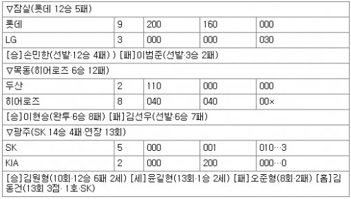히어로즈는 정규리그 2위를 확정하고 2년 연속 플레이오프에 직행한 두산을 상대로 선발 전원 안타를 기록하며 15-7로 승리했고, 롯데는 LG를 9-3으로 꺾었다.