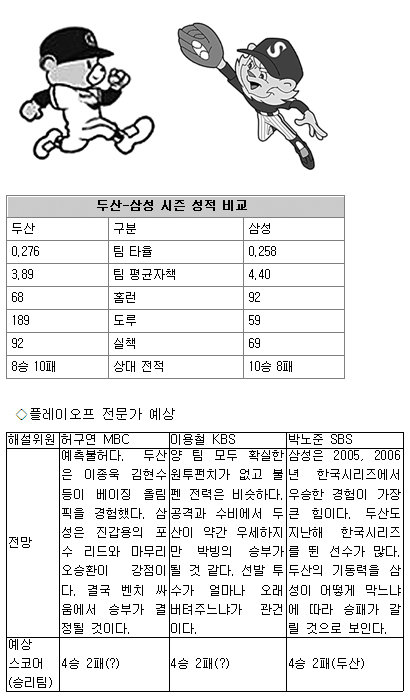 야구 전문가들은 “두산과 삼성 양 팀 벤치의 수 싸움이 치열할 것”이라며 “두산의 타력과 기동력을 삼성이 얼마나 효과적으로 막아내느냐가 승부처”라고 전망했다.